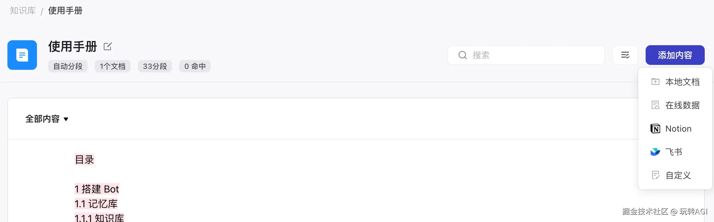 完成知识库创建和内容导入后,你就可以在智能体和工作流中添加知识库内容进行调用了,详情可参考使用知识库。