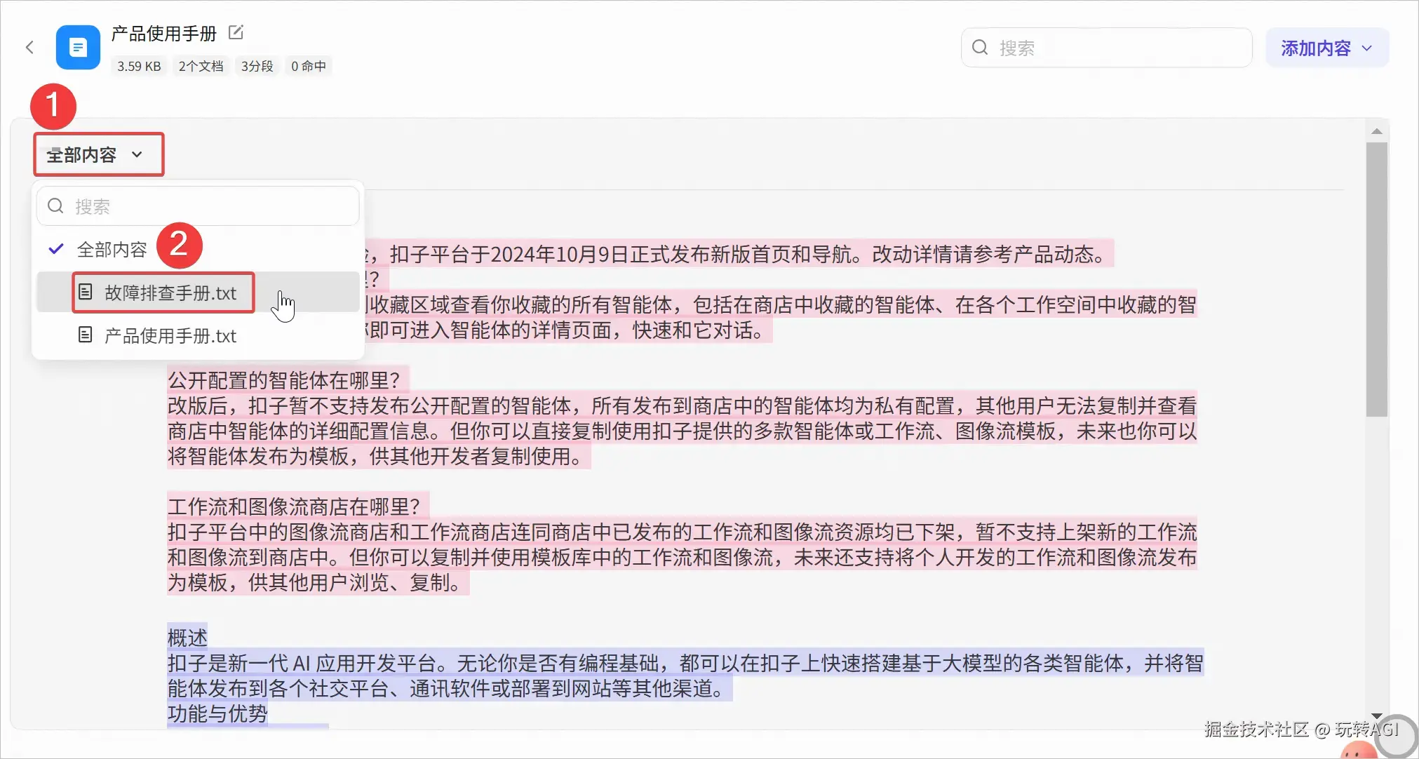 客服场景:将用户高频咨询的产品问题和产品使用手册等内容上传到扣子知识,智能体可以通过这些知识精准回答用户问题。