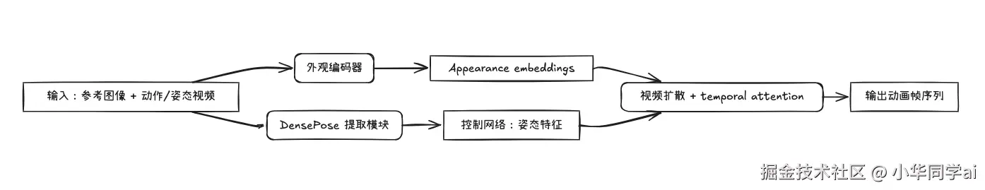 - DensePose 控制网关(ControlNet) 接受人体姿态输入,让动画姿态精准拟合来源动作视频。