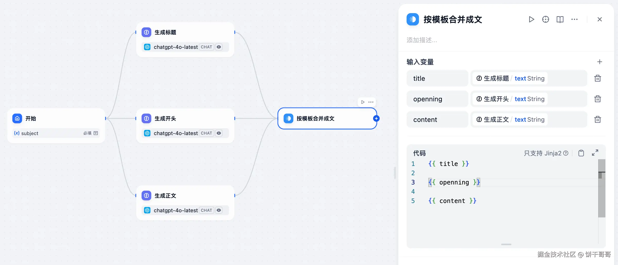 在AI应用中,常需要将来自不同节点或变量的文本片段、数据项组合成单一的、结构化的文本输出,作为后续LLM的提示词、用户回复或日志记录。模板转换节点为此提供了便捷的解决方案。例如,将分散的文章标题、开头和正文内容合并成一篇完整文档。