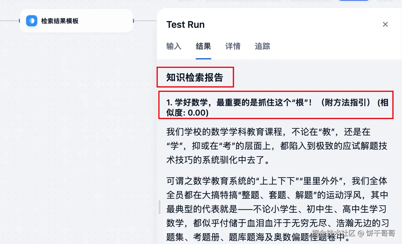 从知识库检索到的信息往往包含多个内容片段及其元数据(如相似度得分、来源等)。模板转换节点能将这些原始数据优雅地格式化为易读的报告,例如Markdown格式,便于呈现或进一步处理。