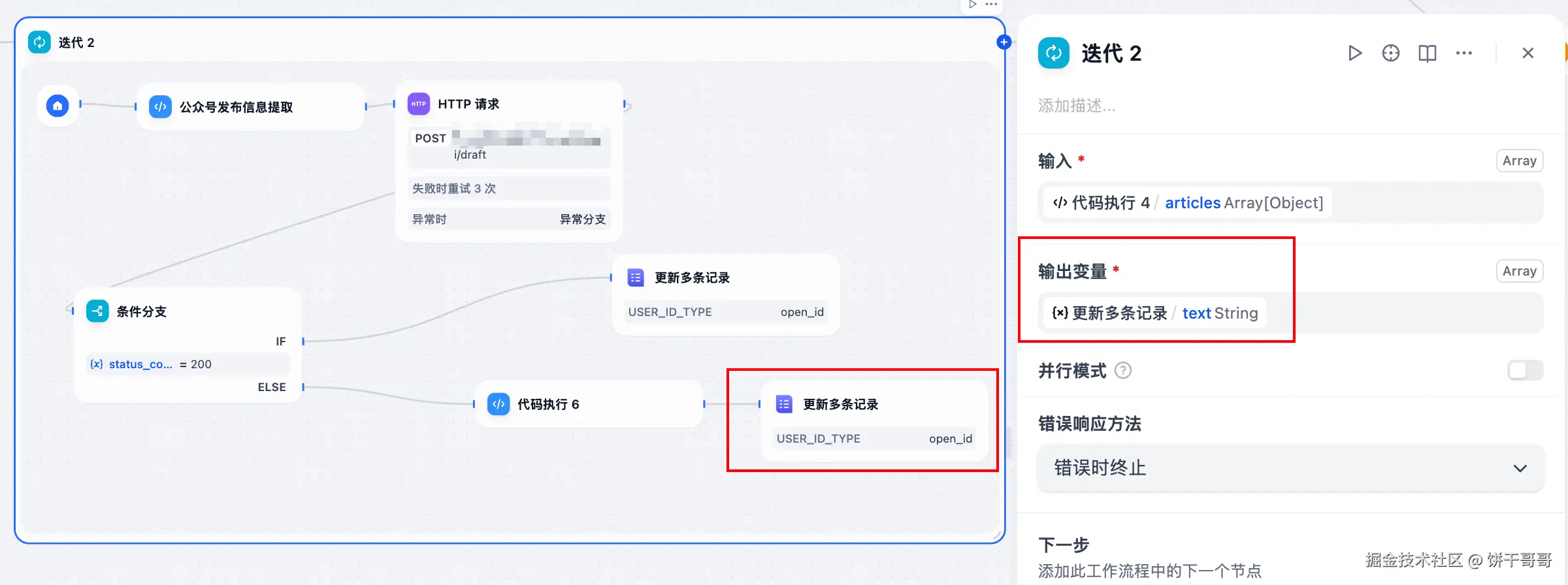 例如我做公众号的工作流,里面有个「迭代」负责把每篇内容分别发布到公众号里