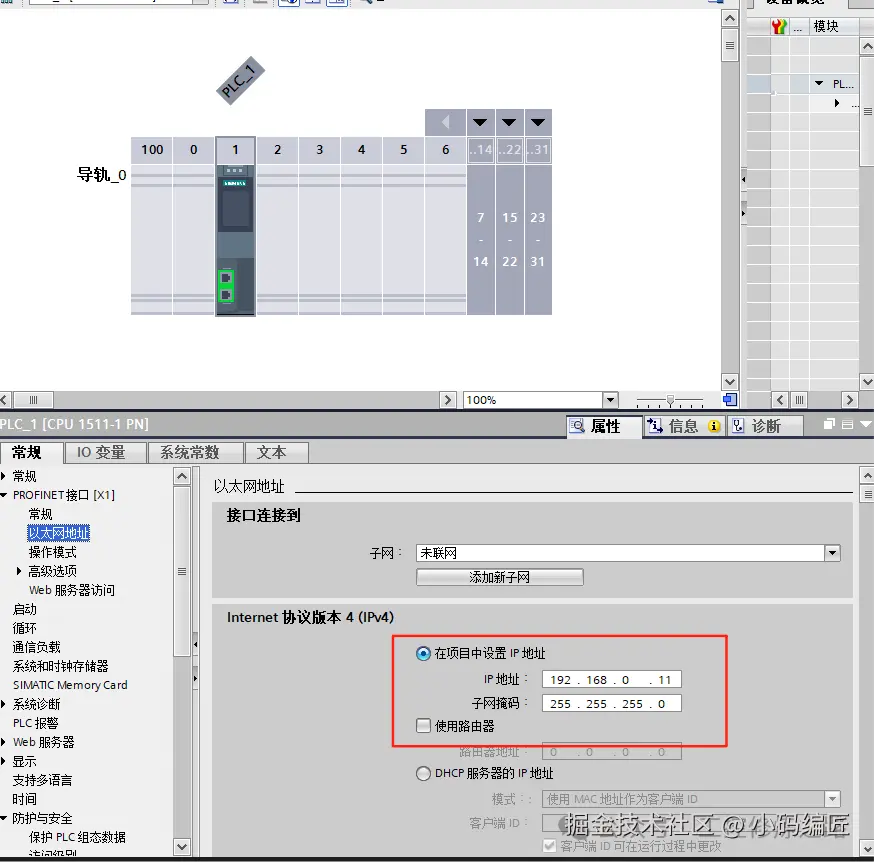 接下来,在博途中新建一个项目,并添加所需的硬件配置。由于我们使用的是S7协议,需勾选PUT/GET选项以便于后续的数据交互。