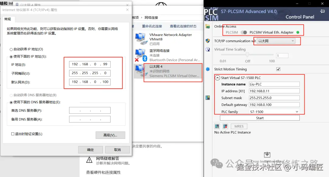 首先,在PLCSIM Advanced 4.0中创建一个虚拟PLC,并设置其IP地址,确保它与本机处于同一网段。启动虚拟PLC后,若没有通过博途连接,会显示黄色警告灯。