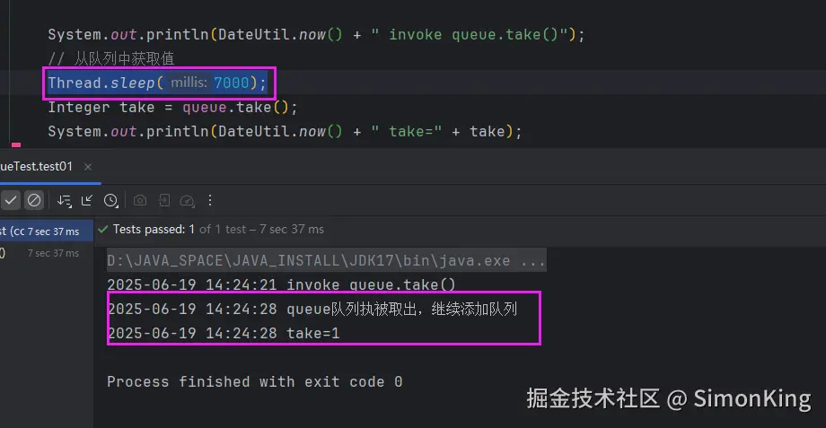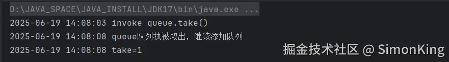 案例中启用了定时器,5s后才会向队列中添加元素。当代码执行到queue.take()就会阻塞,直到5s后元素被添加,才会继续向下执行。