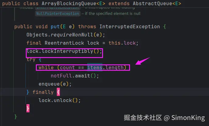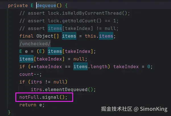 阻塞队列的put()通过加锁的方式保证线程的安全,当队列的数据等于初始化的长度时,当前线程就是阻塞进入等待,直到被其他线程唤醒才会继续执行。而take()方中的dequeue就可以唤醒阻塞的线程。