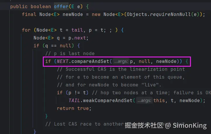 如图所示,就是CAS的体现, compareAndSet(CAS) 是保障线程安全的核心原子操作。因为该方法是有CPU执行直接保证的,我们无法看到具体的实现,通过伪代码了解下: