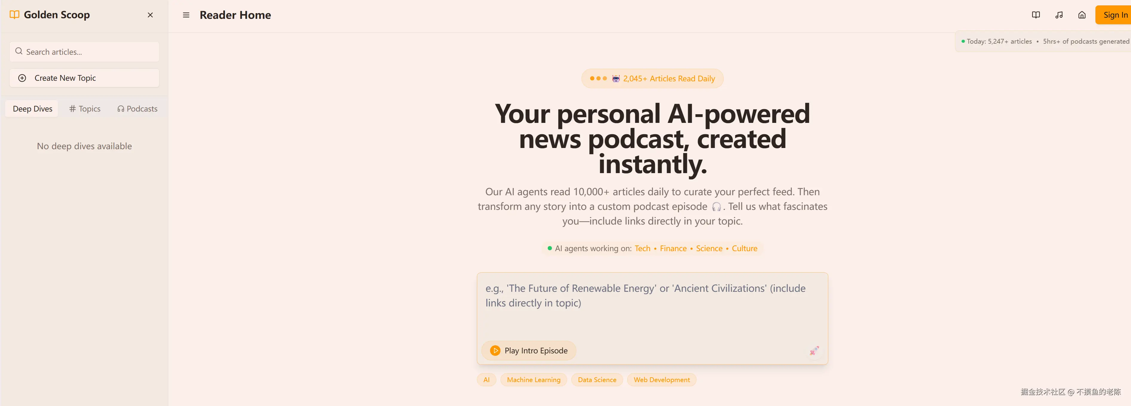 GoldenScoop是一款可以生成播客的应用,能根据用户关心的主题,生成个性化的时间线和播客内容,用于追踪最新信息。