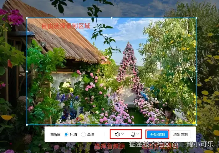 第2步:直接拖动选区框框选出打算录制的区域,然后把麦克风和扬声器选项都打开(根据实际需求来)。如果你想给视频加上水印,还可以打开 “图片水印” 这个功能,可以自由设置水印的图片等。弄完后,直接点击软件的 “录制” 按钮就可以开始录制视频了。
