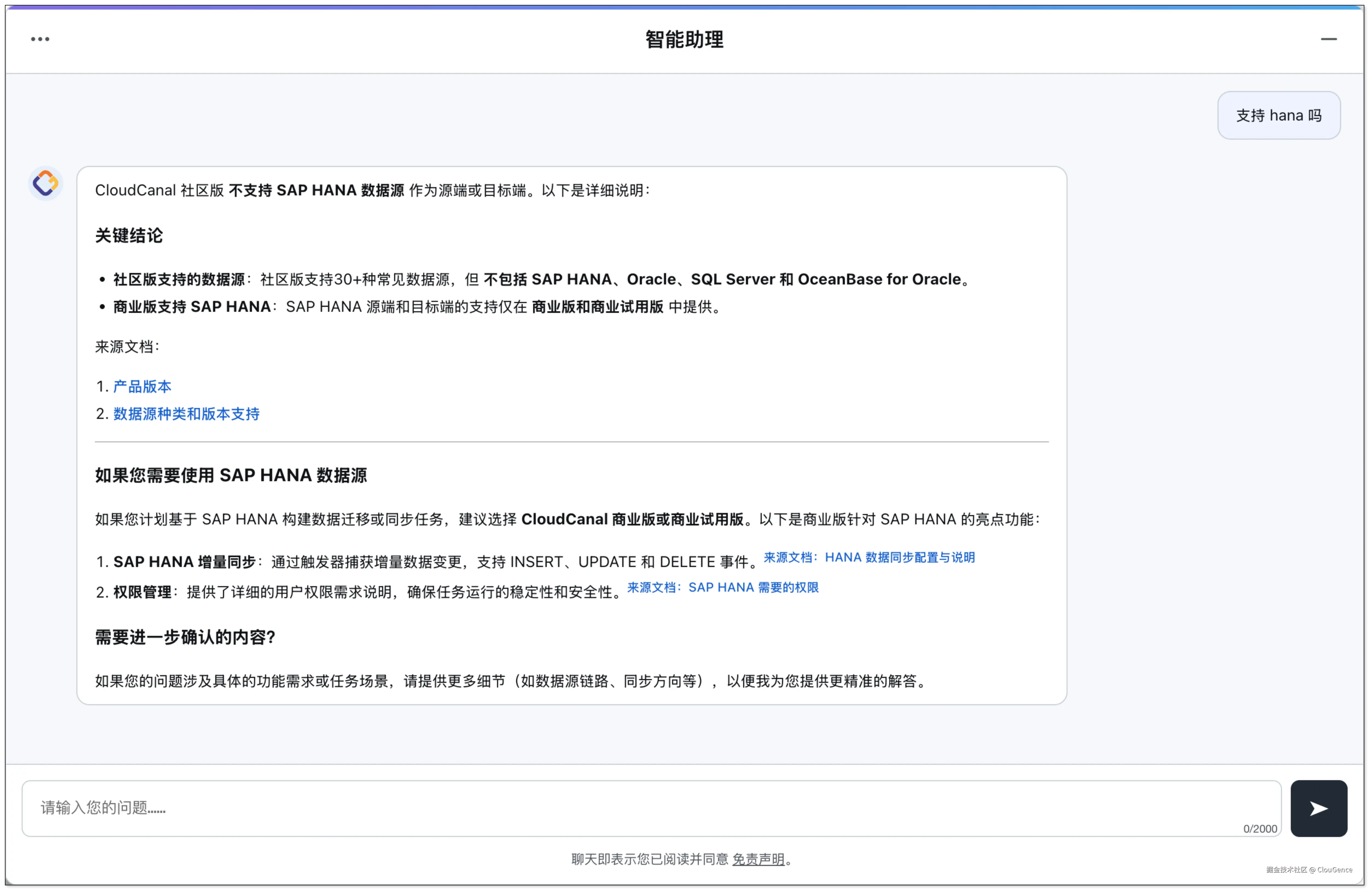 - 针对问题 “CloudCanal 社区版支持 SAP Hana 吗?”,系统判断属于“产品功能 + 产品定价”模块,只在相关知识表中查询。