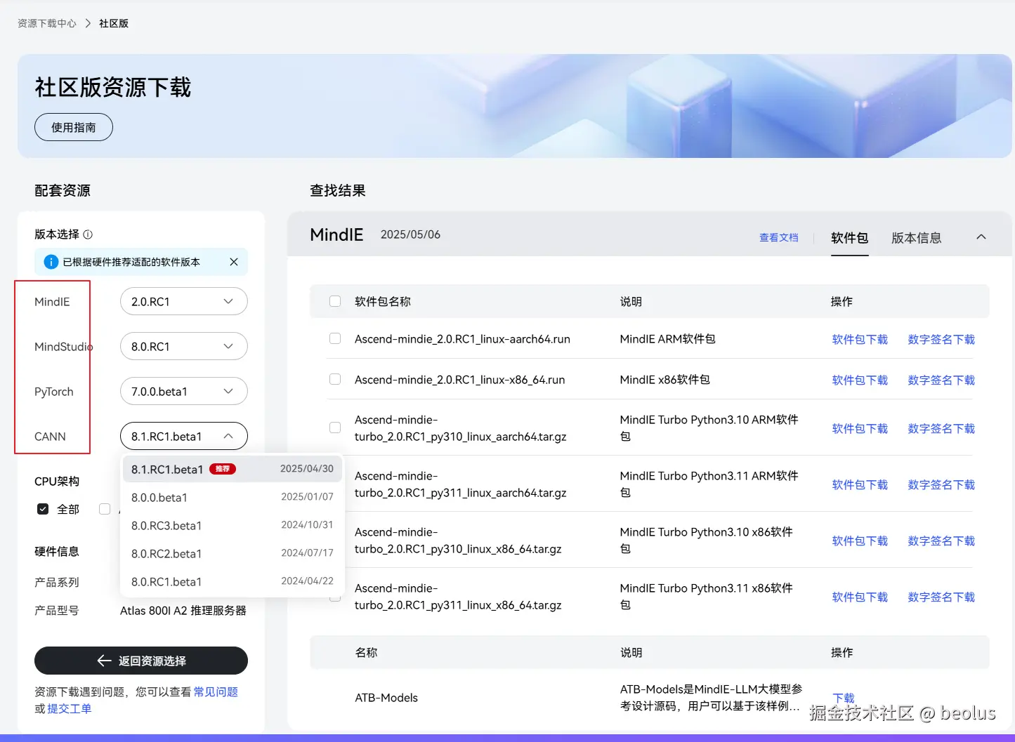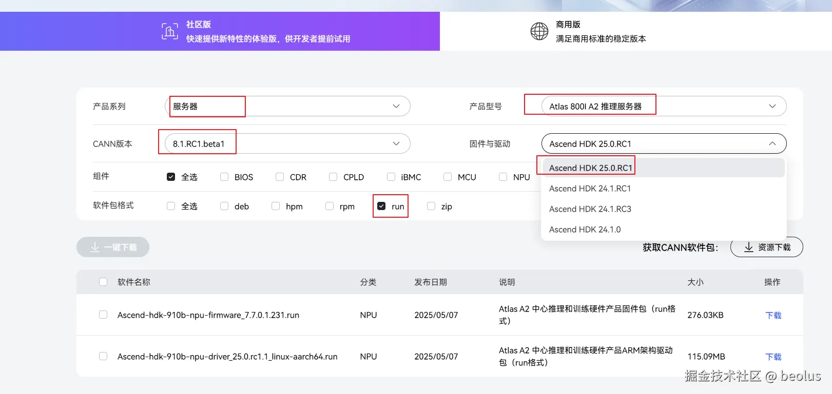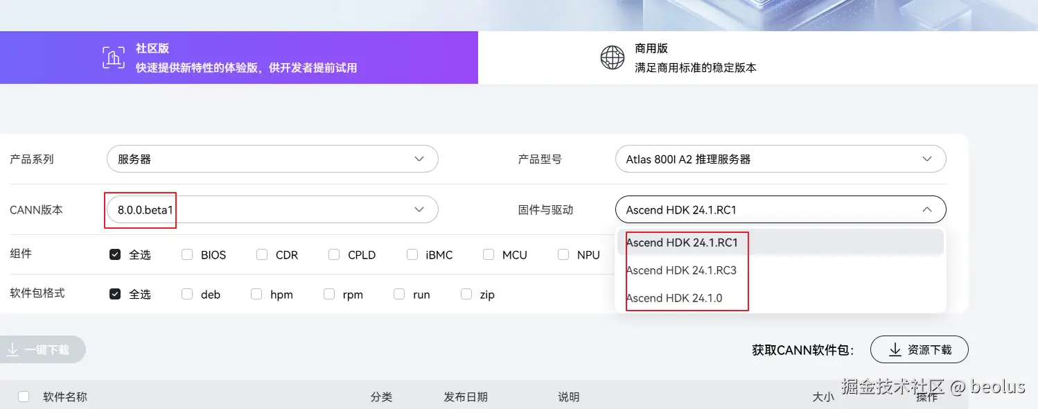 一般建议选择新版本CANN和固件驱动,固件驱动有多个兼容版本,建议选最新版本。(可以根据软件发布时间来判断版本的新旧)