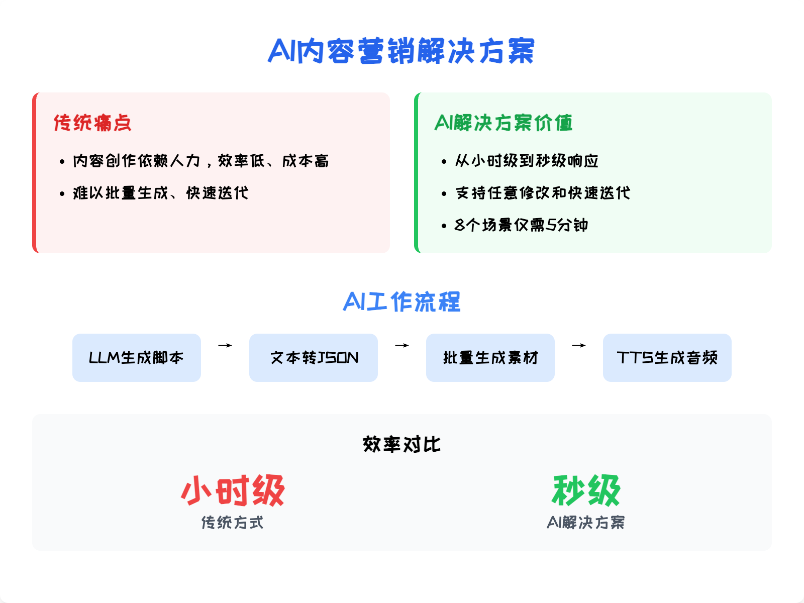 AI 时代的内容营销不再依赖人工撰写,而是通过 AI 自动生成脚本、文案、视频配音等素材,快速响应市场需求。