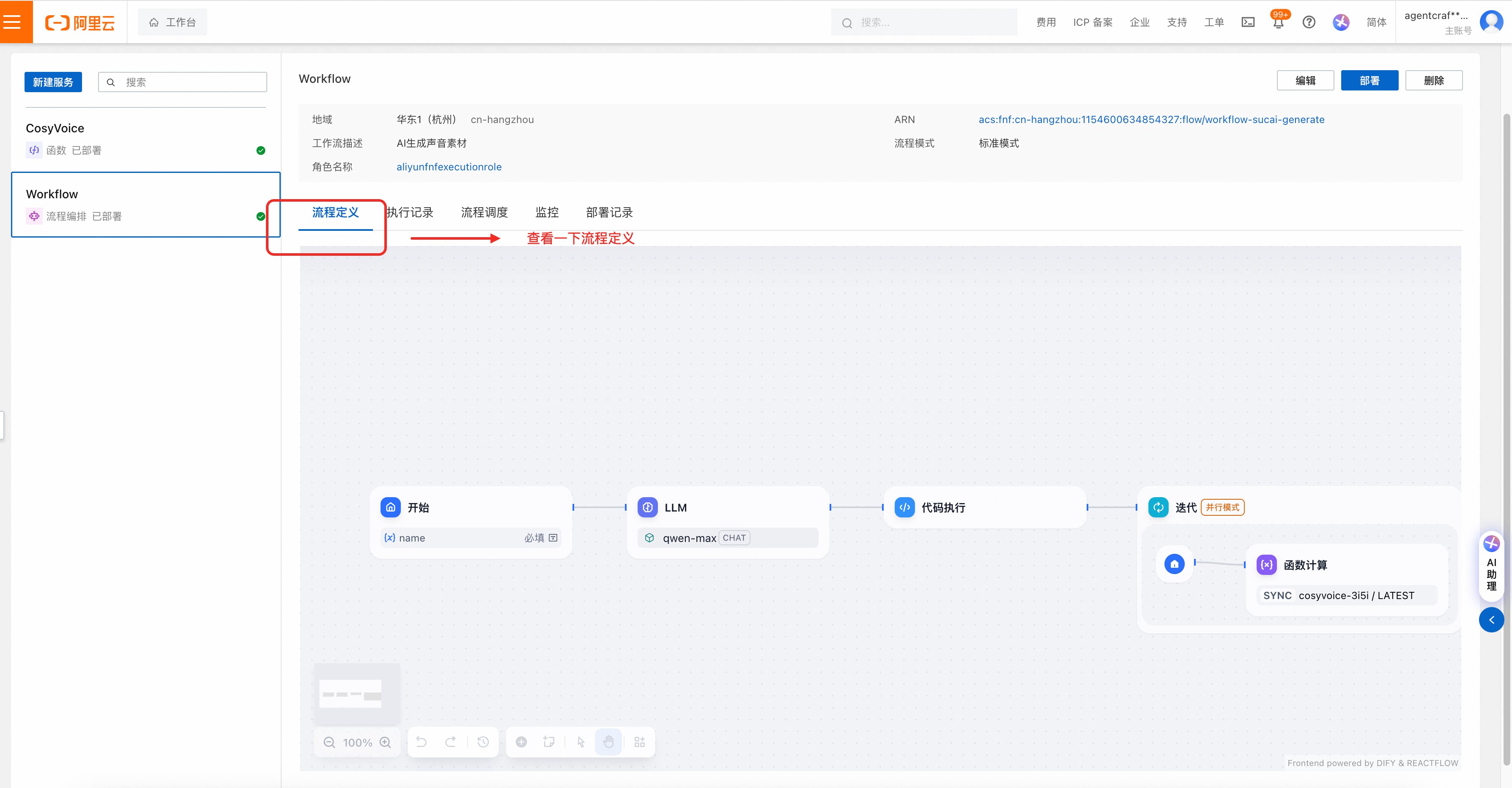步骤二:部署完成后点开Workflow服务,查看以下定义