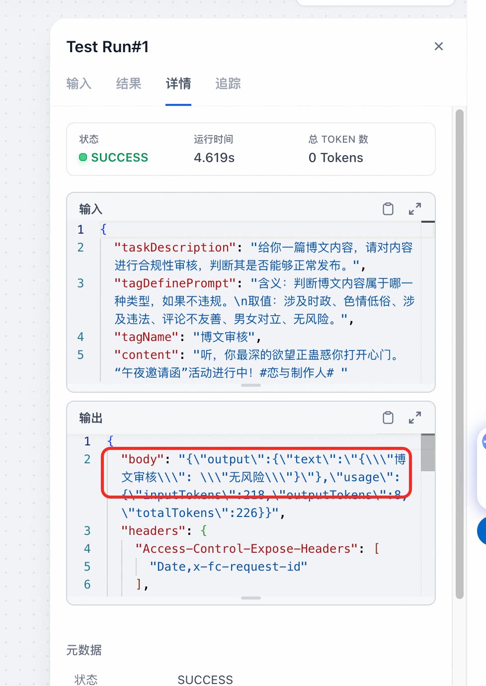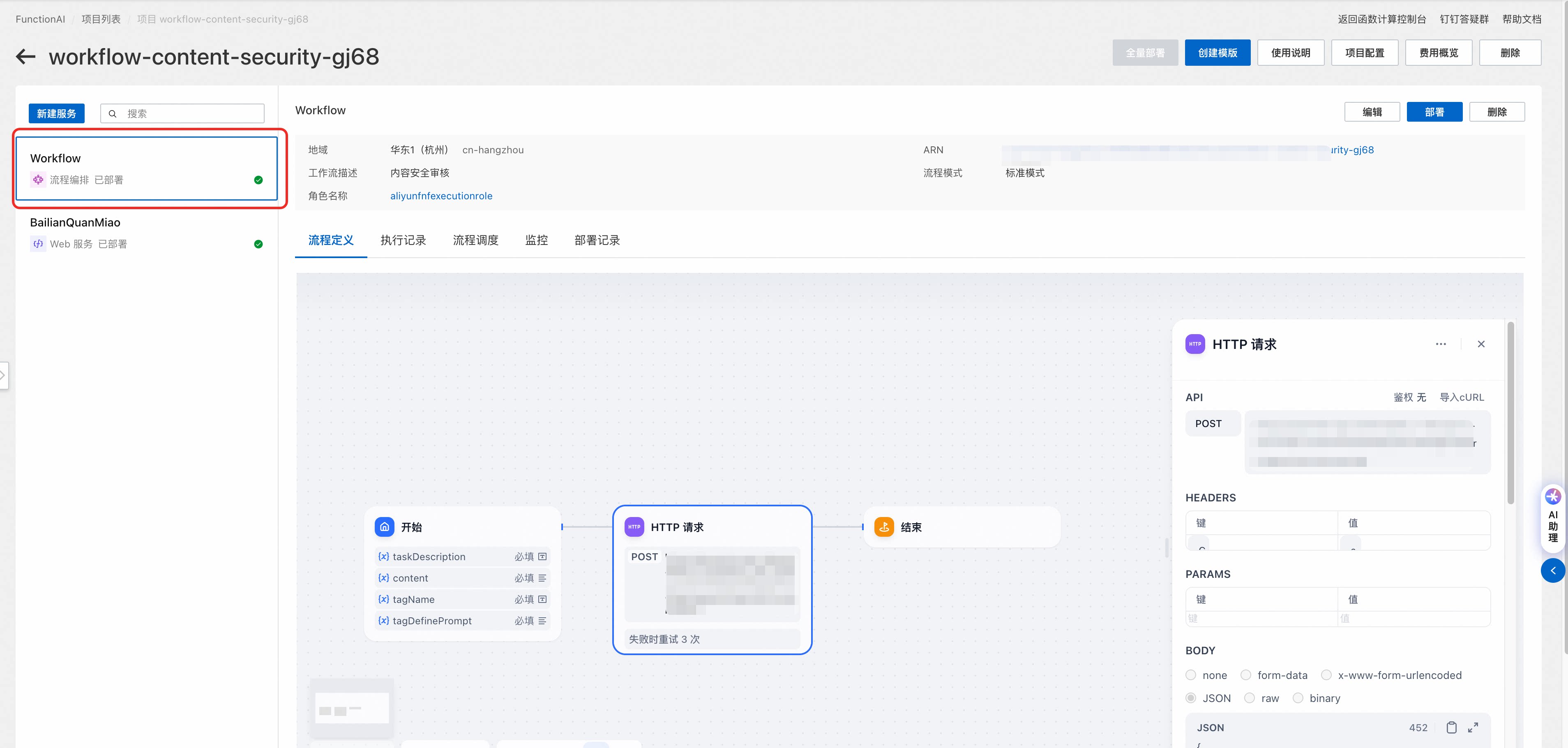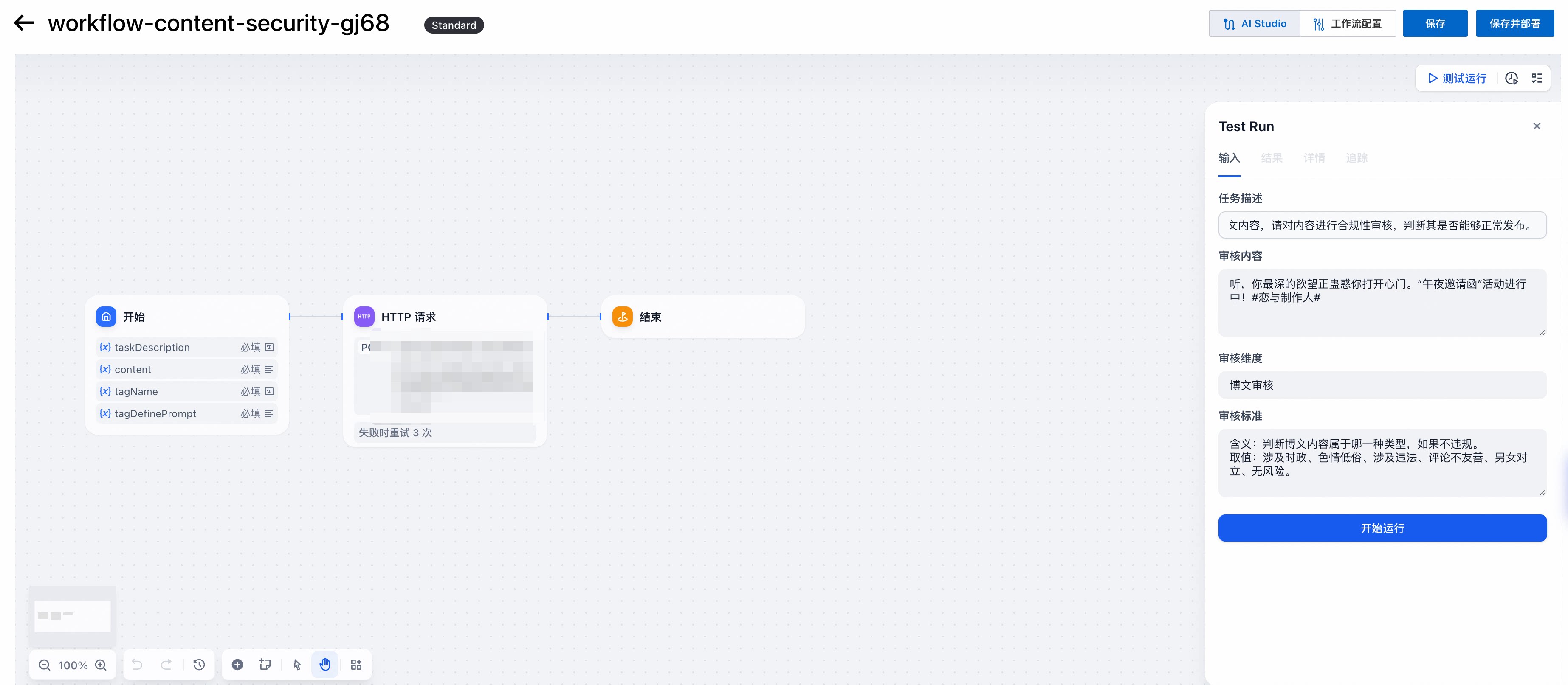 | http节点 | 访问阿里云百炼全秒内容安全审核服务(会自动帮您创建内容审核安全服务) |