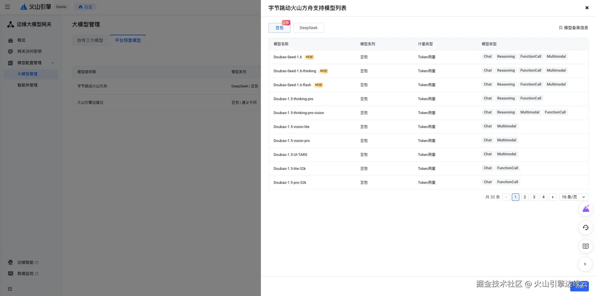 一是通过平台预置模型,边缘大模型网关预置模型中,新增豆包****大模型 1.6 系列,您可直接使用并对其创建网关访问密钥;