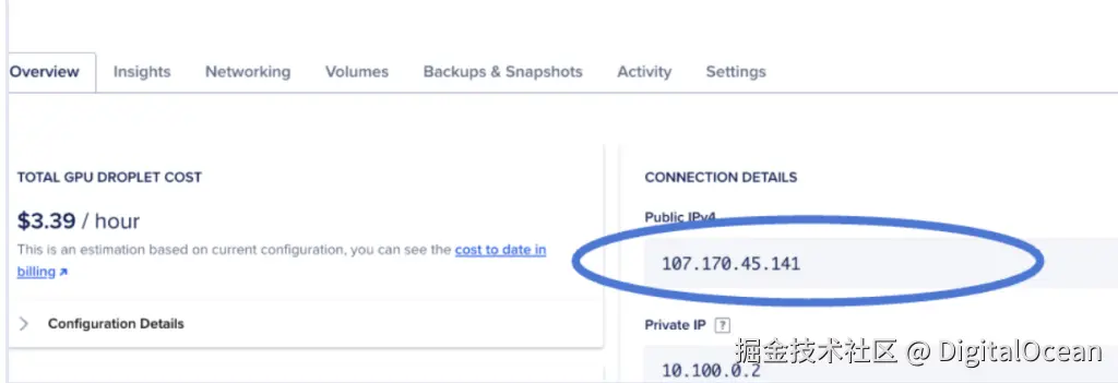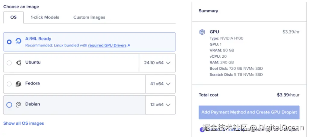 首先设置一个 DigitalOcean GPU Droplet云服务器,选择 AI/ML 并选择 NVIDIA H100 选项。具体方法,我们在往期博客中介绍过,进入 DigitalOcean 后台之后,选择 Creat GPU Droplet,然后选择所需要的配置即可。当然,你也可以选择其他型号的 GPU,比如 最新发布的 AMD MI300X,包含按需实例。