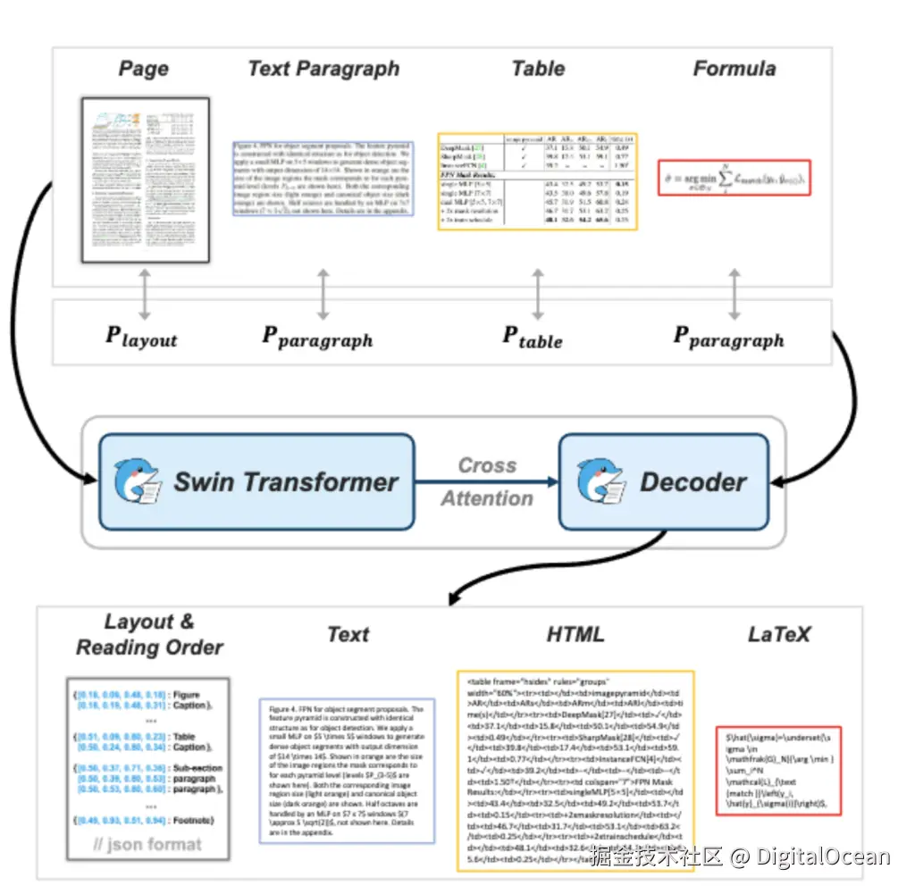 Dolphin 利用编码器-解码器变压器架构。编码器是一个 Swin Transformer,其中页面图像是输入并输出为一系列视觉嵌入。使用交叉注意机制和提示“解析此文档的阅读顺序”,mBart 解码器关注编码的视觉特征,以导出保持结构关系的序列布局元素。