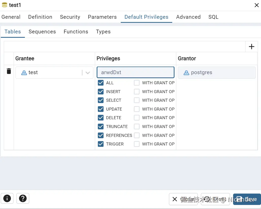 PgAdmin 中配置默认权限: