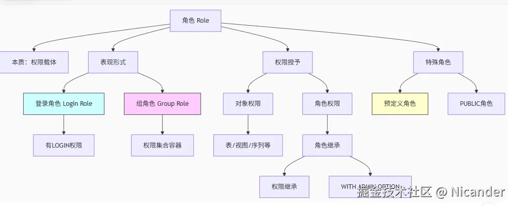 - 角色和用户本质是同一个东西,只是创建语法不同(CREATE ROLE vs CREATE USER),用户实际上是带登录权限的特殊角色