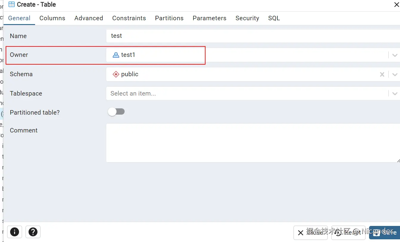 - 在创建数据表时候,设置数据表的 owner 为刚创建的用户。(如果使用的是这个用户创建数据表,则默认 owner 就是这个用户)