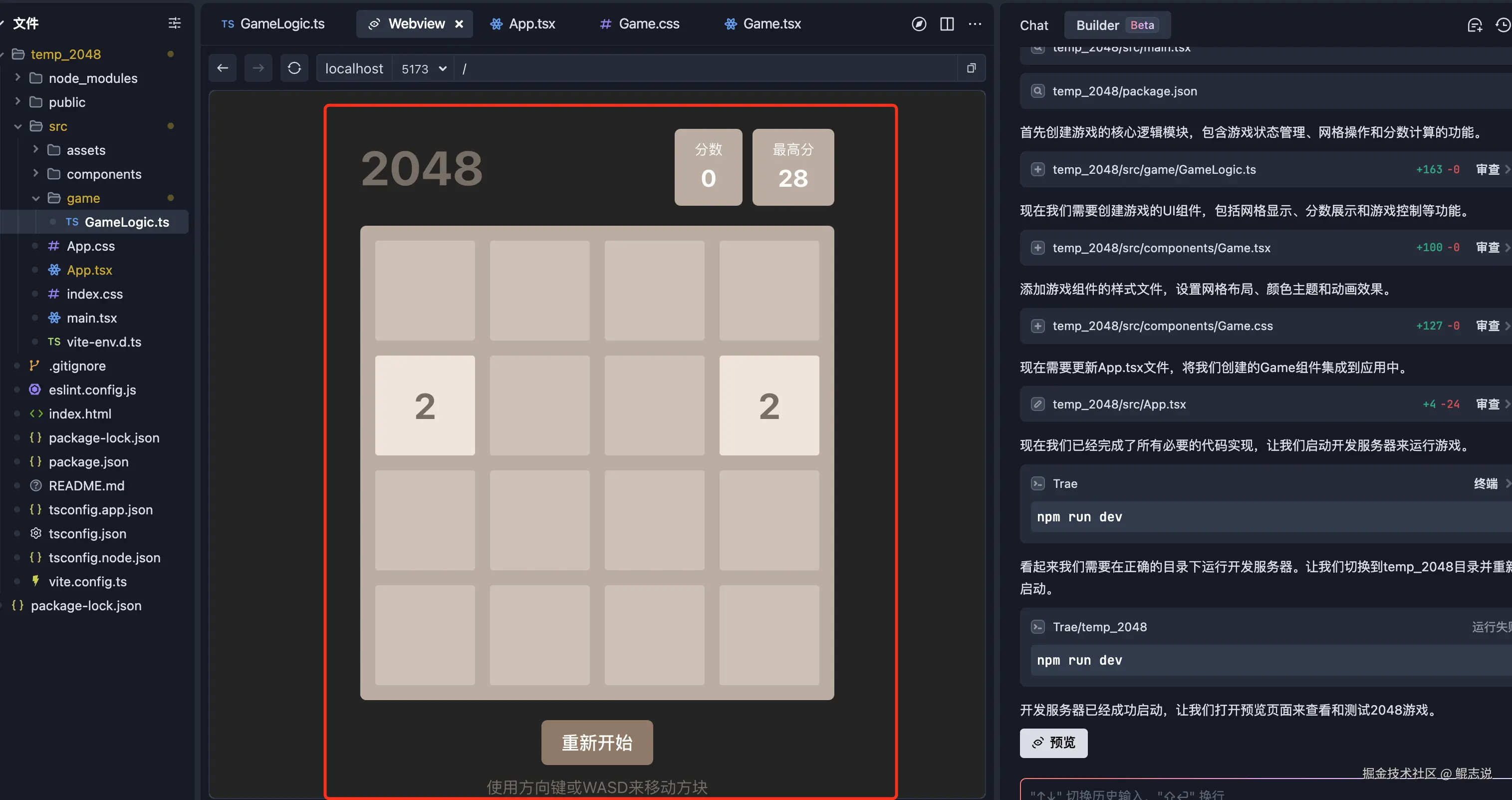 当我第一次在Trae中输入"做一个能发朋友圈的2048"时,预期的是一场大型翻车现场。毕竟体验过太多所谓"智能开发工具"——要么只懂单行补全,要么生成代码像意大利面条。