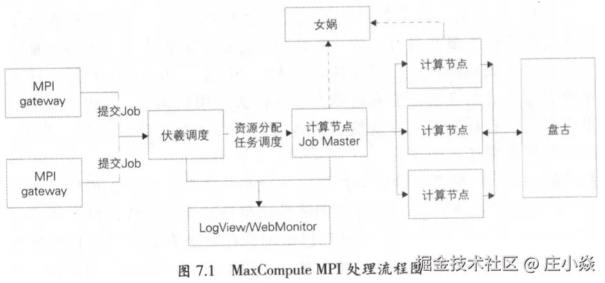 MaxComputeMPI的处理流程如图7.1所示,与分布式计算系统的原理类似,不再赘述。其中伏羲为阿里云飞天系统的分布式调度系统,女娲为阿里云飞天系统的分布式一致性协同服务系统,盘古为阿里云飞天系统的分布式文件存储系统。