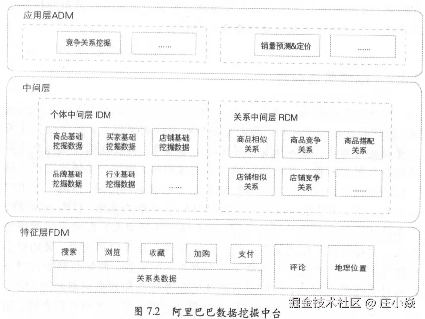 基于以上分析,我们把数据中台分为三层:特征层(Featural Data Mining Layer,FDM)、中间层和应用层(Application-oriented Data Mining Layer,ADM),其中中间层包括个体中间层(Individual Data Mining Layer,IDM)和关系中间层(Relational Data Mining Layer,RDM),如图7.2所示。