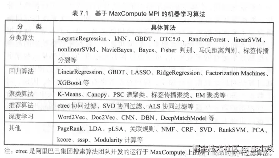 基于MaxComputeMPI,目前阿里巴巴的算法平台已经集成了绝大部分业界主流的机器学习算法(见表7.1),从传统的分类、聚类算法,到互联网应用中非常流行的协同过滤、PageRank算法,再到当前最火热的深度学习算法,这些算法基本可以满足企业级数据挖掘应用的需要。配合阿里巴巴的大数据计算平台MaxCompute,工程师们可以通过简易的命令式调用或拖拽式的可视化界面操作,将这些算法应用于自己的实际业务当中,体验机器学习算法与大数据结合后的强大功能与魅力。