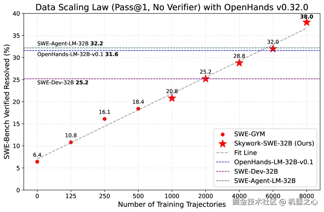 这份数据集不仅让 Skywork-SWE-32B 成为当前 32B 参数规模下最强的开源软件工程模型之一,更重要的是,它揭示了 LLM 在 SWE 任务中持续增长的性能与数据之间的强相关性,首次系统性验证了数据 Scaling Law 在复杂工程任务上的适用性,堪称软件工程智能体的「ImageNet」。