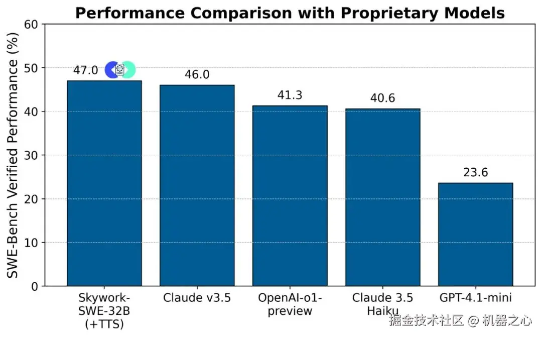 相较于主流的一些闭源模型,经过 TTS 后的 Skywork-SWE-32B 的表现也相当不俗:显著超越了 GPT-4.1-mini(23.86%)、 Claude 3.5 HaiKu(40.6%)和 OpenAI-o1-preview (41.3%),并且领先于 Claude v3.5(46.0%)。