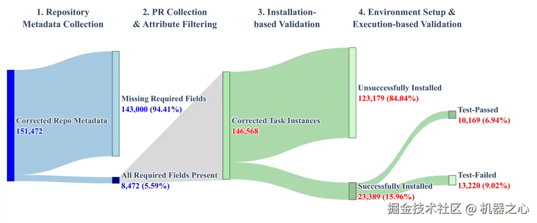 为了获得高质量数据,昆仑万维构建了构建了一套自动化、结构化、可复现的 SWE 数据收集与验证流程,共分为三大阶段、九个步骤。