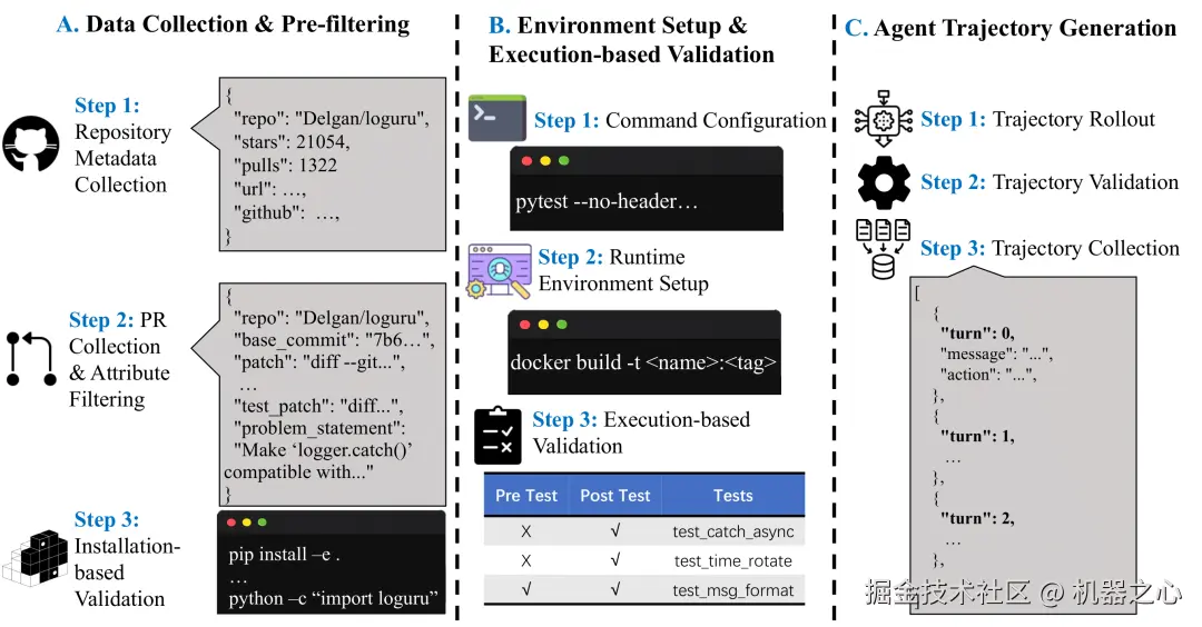 具体来说,阶段 A 的工作是数据采集与预筛选,其中又细分为 GitHub 元数据抓取、PR(Pull Request)收集与任务初筛和安装验证 3 个步骤。第一阶段的处理下来,昆仑万维团队从 15 万个开源仓库中得到了 23,389 个有效任务样本。为了防止数据泄漏,排除 SWE-bench Verified(测试数据集)已包含的仓库。