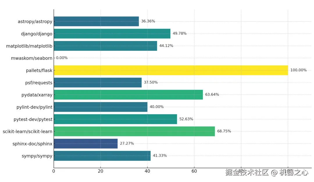 而右图则给出了 Skywork-SWE 数据集的仓库名称词云。可以看到,其中不仅涵盖如 Pydantic、SQLGlot、DVC 等主流开源项目,还包含大量中小型仓库,呈现出高度贴近真实开发生态的任务分布特征。这种贴近真实开发生态的数据构成,有助于提升模型在复杂多样场景下的问题解决能力。