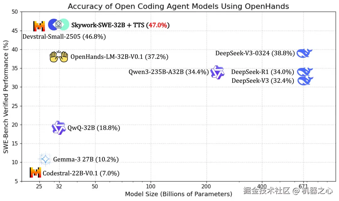 在广受关注的 SWE-bench Verified 基准(包含 500 个实例,来自 12 个流行 Python GitHub 库的 PR)上,Skywork-SWE-32B 在 OpenHands Agent 框架下取得了 47% 的准确度,超越了现有参数规模在 32B 以下的开源模型,甚至优于参数量高达 671B 的 DeepSeek-V3-0324 模型。