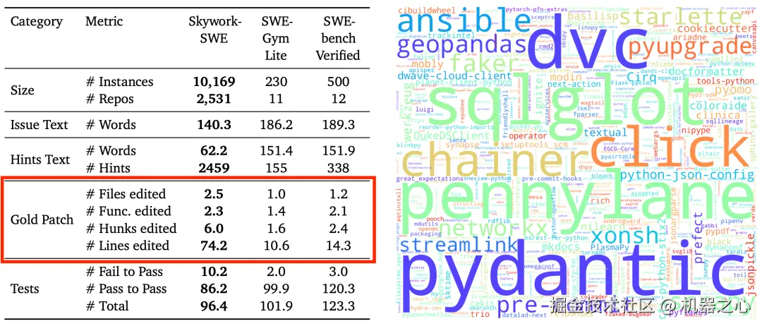 Skywork-SWE 数据集统计表与 GitHub 仓库词云图