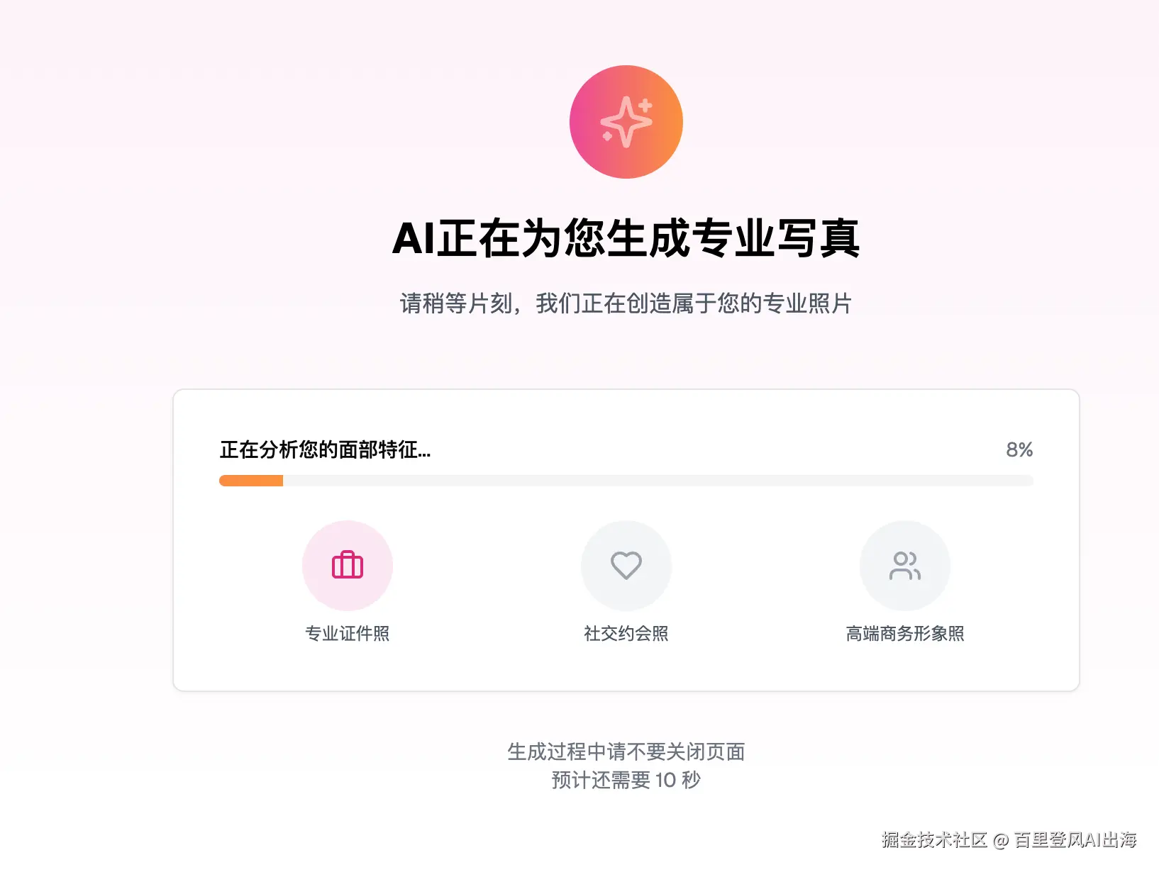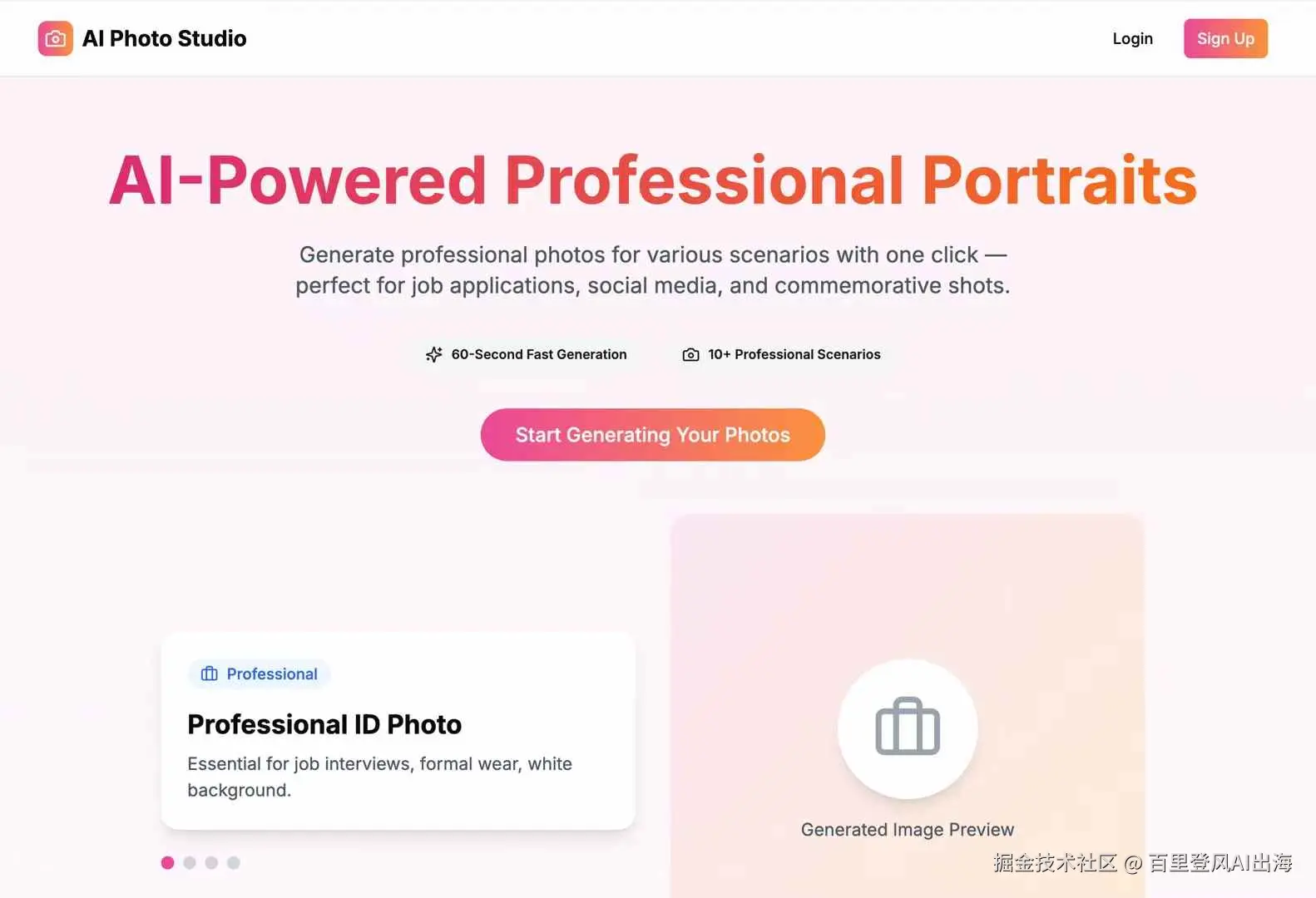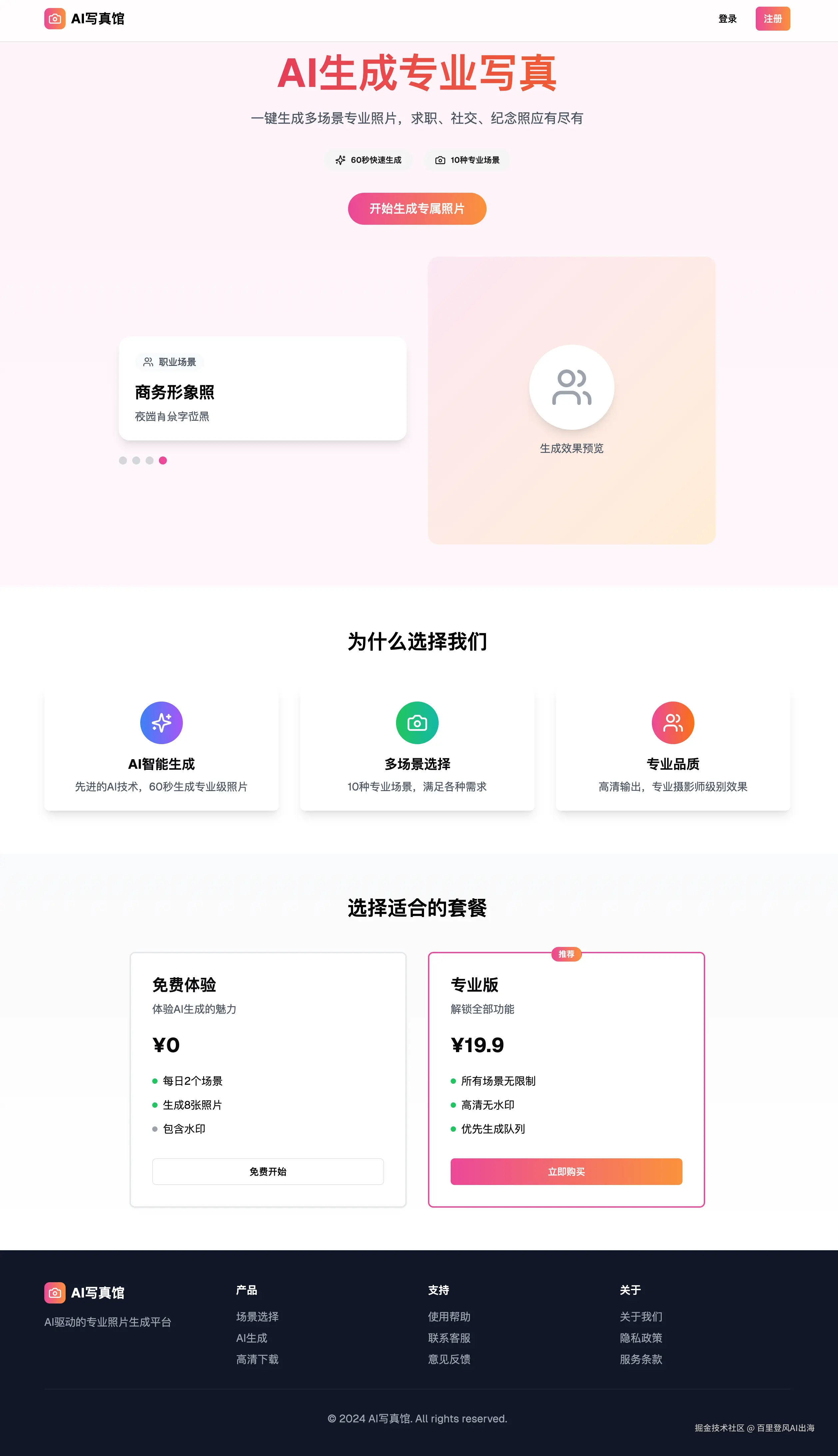 这是我开发的产品,10大场景下的AI摄影生成工具。(目前小bug还比较多,当然后面需要慢慢优化,比如登陆界面还没做,支付还没接等等。)