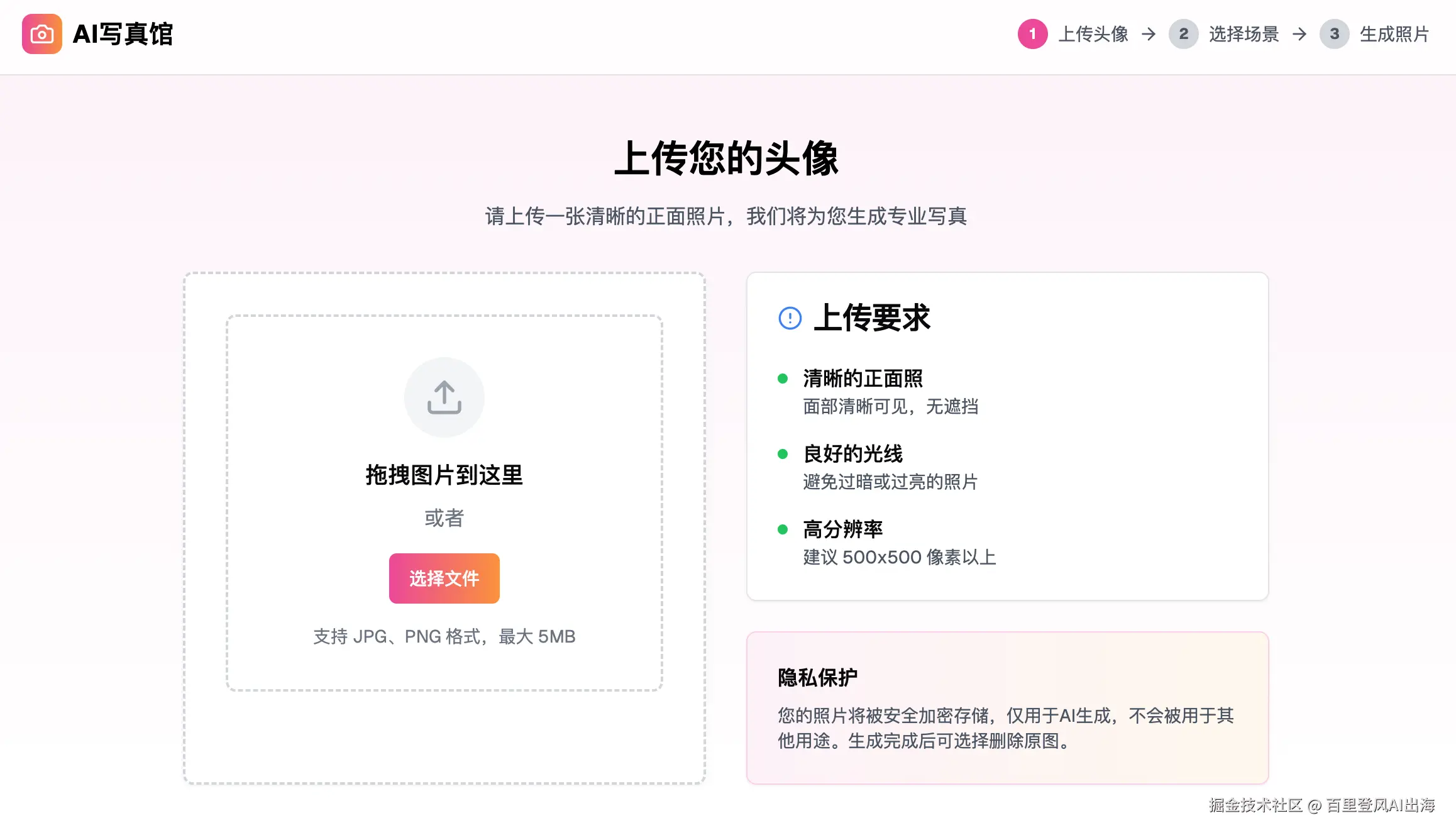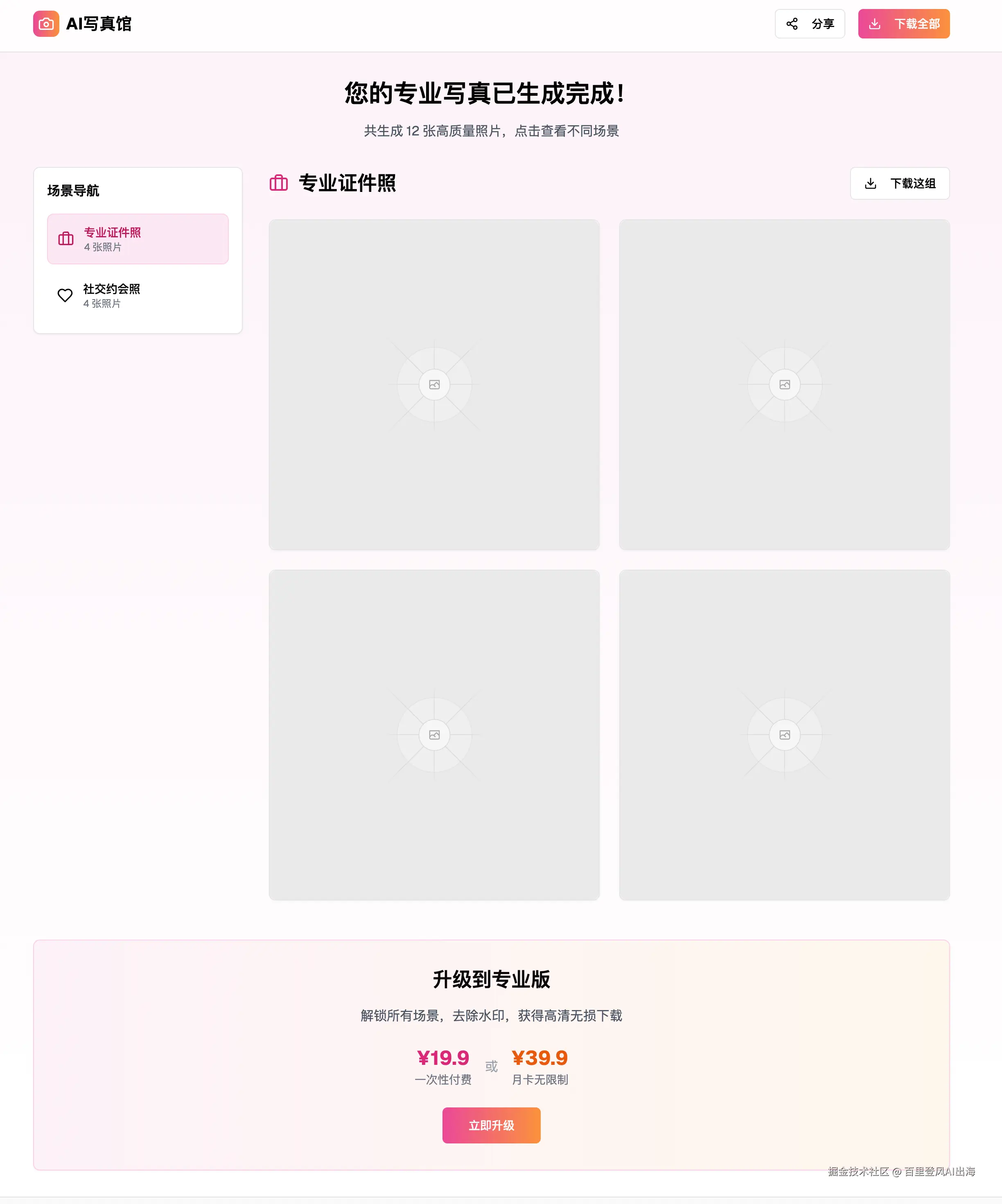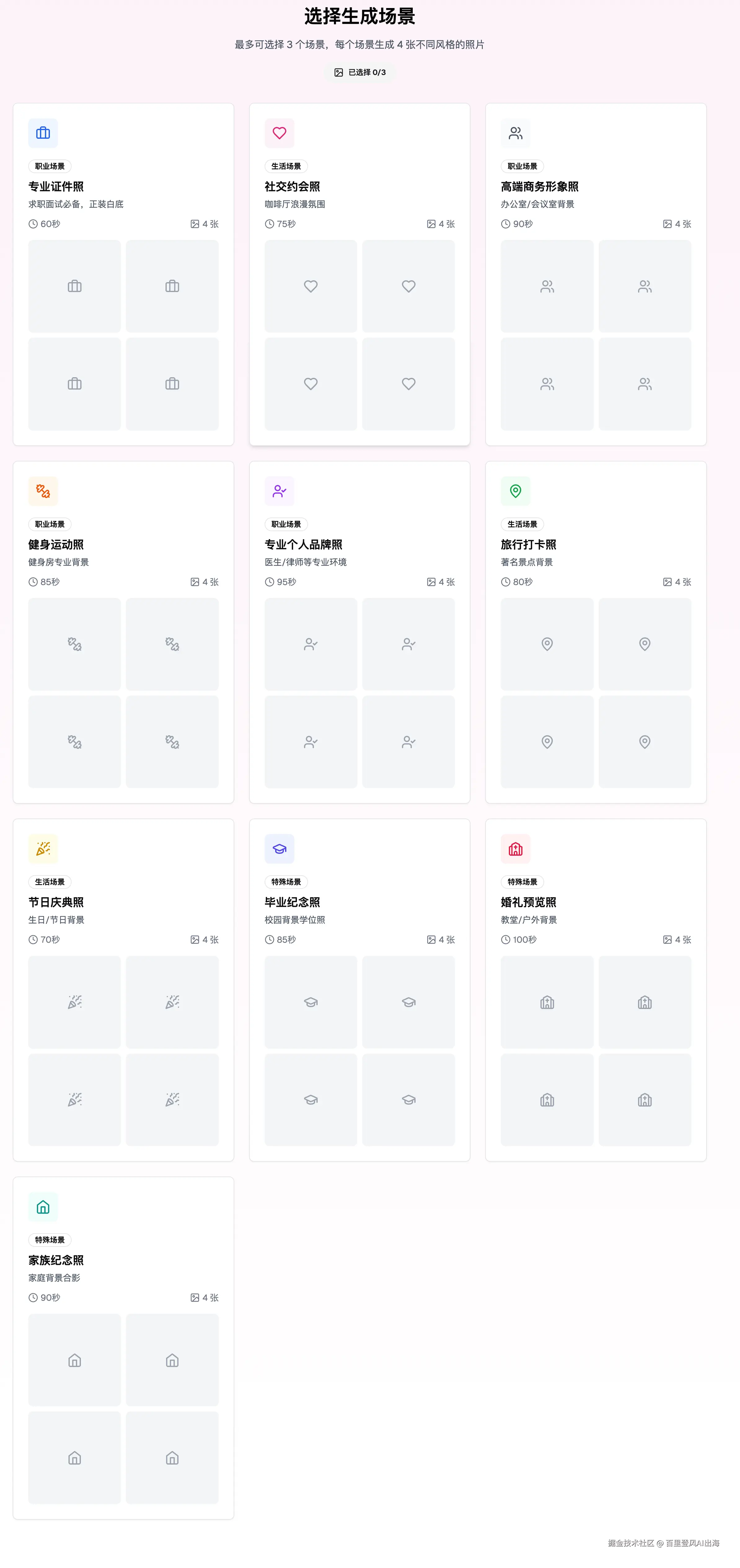 这是我开发的产品,10大场景下的AI摄影生成工具。(目前小bug还比较多,当然后面需要慢慢优化,比如登陆界面还没做,支付还没接等等。)