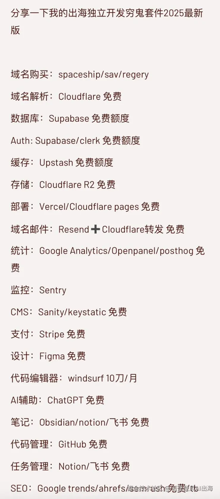 下面这张图是网友总结的,可以看到:除了域名和AI编程工具,其他真的是免费的。 (程序员很老实,从来不骗人)