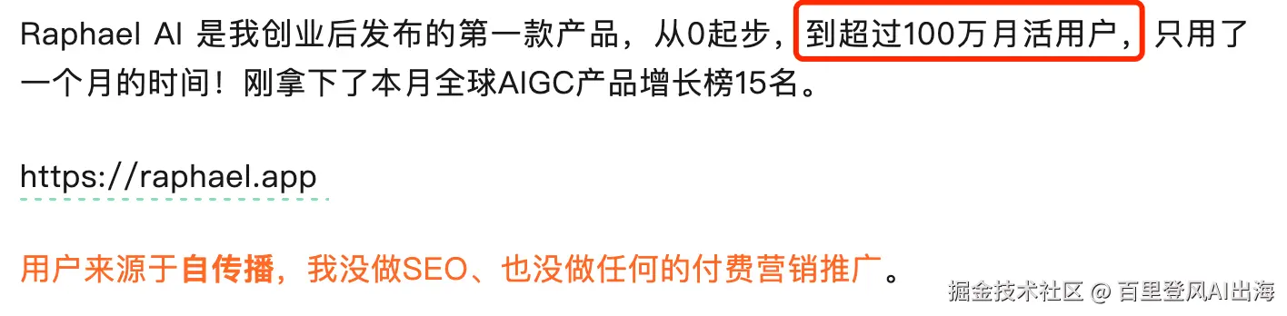 一个人,创业后第一个产品就做到了100万月活,只用了1个月,并且做完就放放那了,都没做任何付费推广。