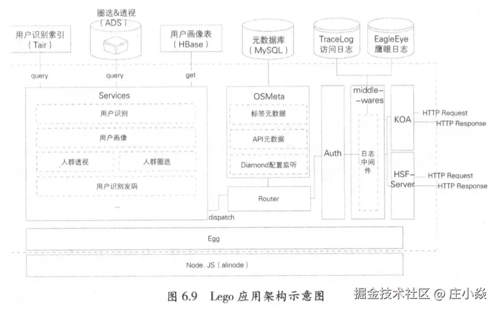 Lego被设计成一个面向中度和高度定制化数据查询需求、支持插件机制的服务容器。它本身只提供日志、服务注册、Diamond配置监听鉴权、数据源管理等一系列基础设施,具体的数据服务则由服务插件提供。基于Lego的插件框架可以快速实现个性化需求并发布上线。Lego采用轻量级的Node.JS技术栈实现,适合处理高并发、低延迟的IO密集型场景,目前主要支撑用户识别发码、用户识别、用户画像、人群透视和人群圈选等在线服务。底层根据需求特点分别选用Tair、HBase、ADS存储数据。
