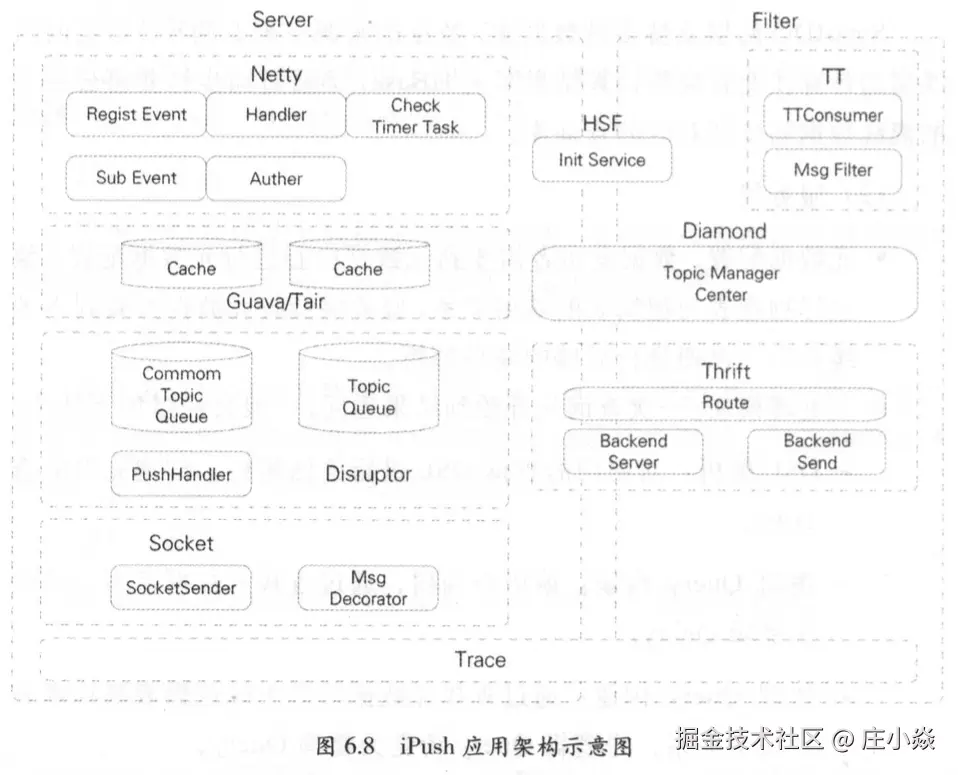 iPush应用产品是一个面向TT、MetaQ等不同消息源,通过定制过滤规则,向Wb、无线等终端推送消息的中间件平台。iPush核心服务器端基于高性能异步事件驱动模型的网络通信框架Netty4实现,结合使用Guava缓存实现本地注册信息的存储,Filter与Server之间的通信采用Thrift异步调用高效服务实现,消息基于Disruptor高性能的异步处理框架(可以认为是最快的消息框架)的消息队列,在服务器运行中Zookeeper实时监控服务器状态,以及通过Diamond作为统一的控制触发中心。