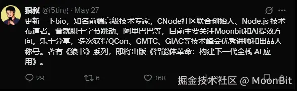 狼叔是知名前端技术专家、CNode 社区联合创始人,以及国内最早的 Node.js 技术布道者之一,他一直活跃在开源技术分享的第一线。并著有广受好评的《狼书》系列技术图书,被众多前端开发者奉为进阶参考,还在 QCon、GMTC、GIAC 等技术大会担任讲师与出品人,多次推动技术思想的传播。基于AI时代对于前端的思考,他目前正在筹备新作《智能体革命:构建下一代全栈 AI 应用》。