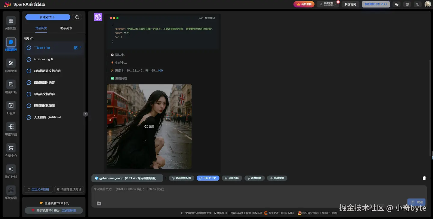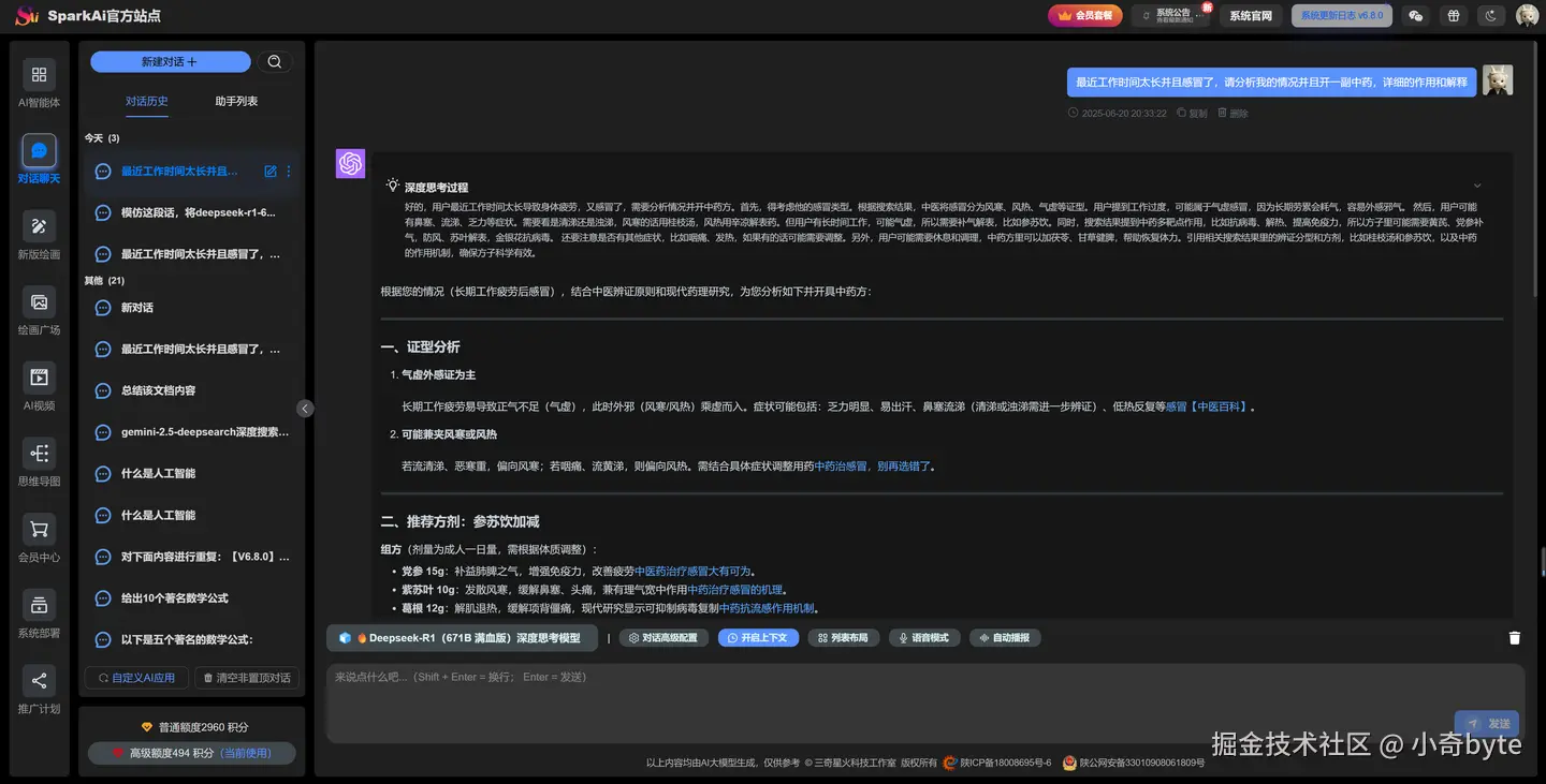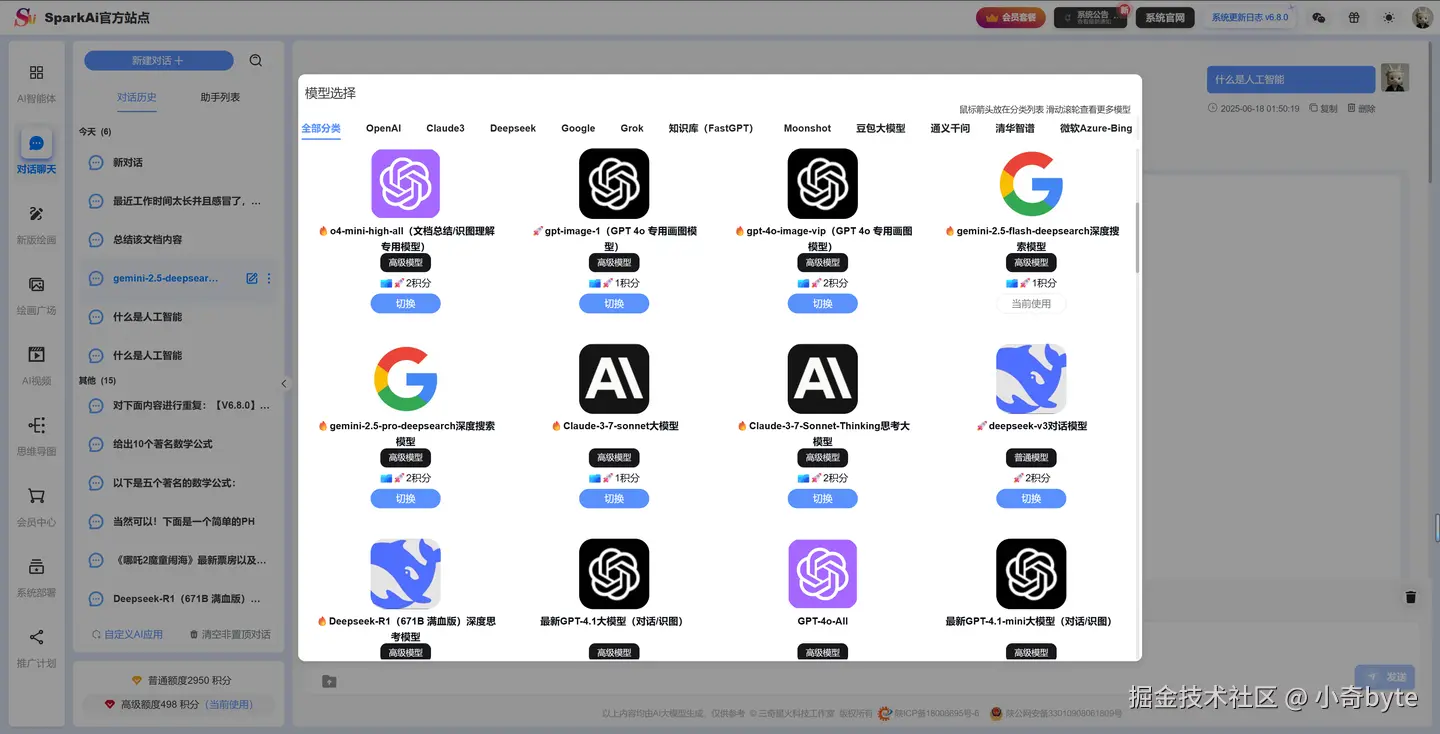 高级模型无需付费(注册即赠送、每天签到等等方式可获取大量大模型使用积分),而且不限使用次数,大家可以自由体验超强的文本生成、AI绘画、代码辅助、知识问答以及多模态互动等各种AI功能。无论你是学生、开发者还是设计师,都可以在这里尽情释放创造力,体验最新最强的人工智能技术。