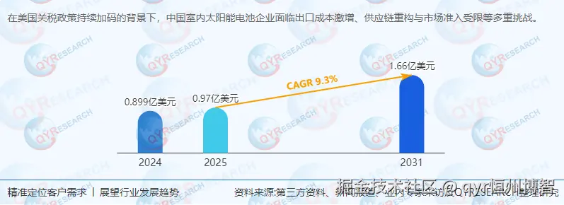 本报告基于全球室内太阳能电池行业数据与政策环境,深度解析供应链重构、区域市场潜力及技术演进路径。根据QYResearch最新调研报告显示,2024年全球市场规模达0.9亿美元,预计2031年将增至1.66亿美元,CAGR为9.3%。美国关税政策倒逼中国企业加速全球化布局,东南亚、中东等新兴市场成为核心增长极。报告指出,电子设备与物联网(IoT)领域需求激增,叠加非晶硅技术迭代与品牌溢价提升,将推动行业进入技术-品牌双驱动的全球化新阶段。