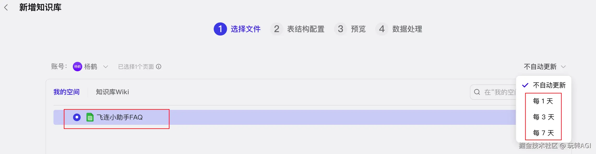 - 选择已创建的飞书表格文档并选择自动更新频率,然后单击下一步。