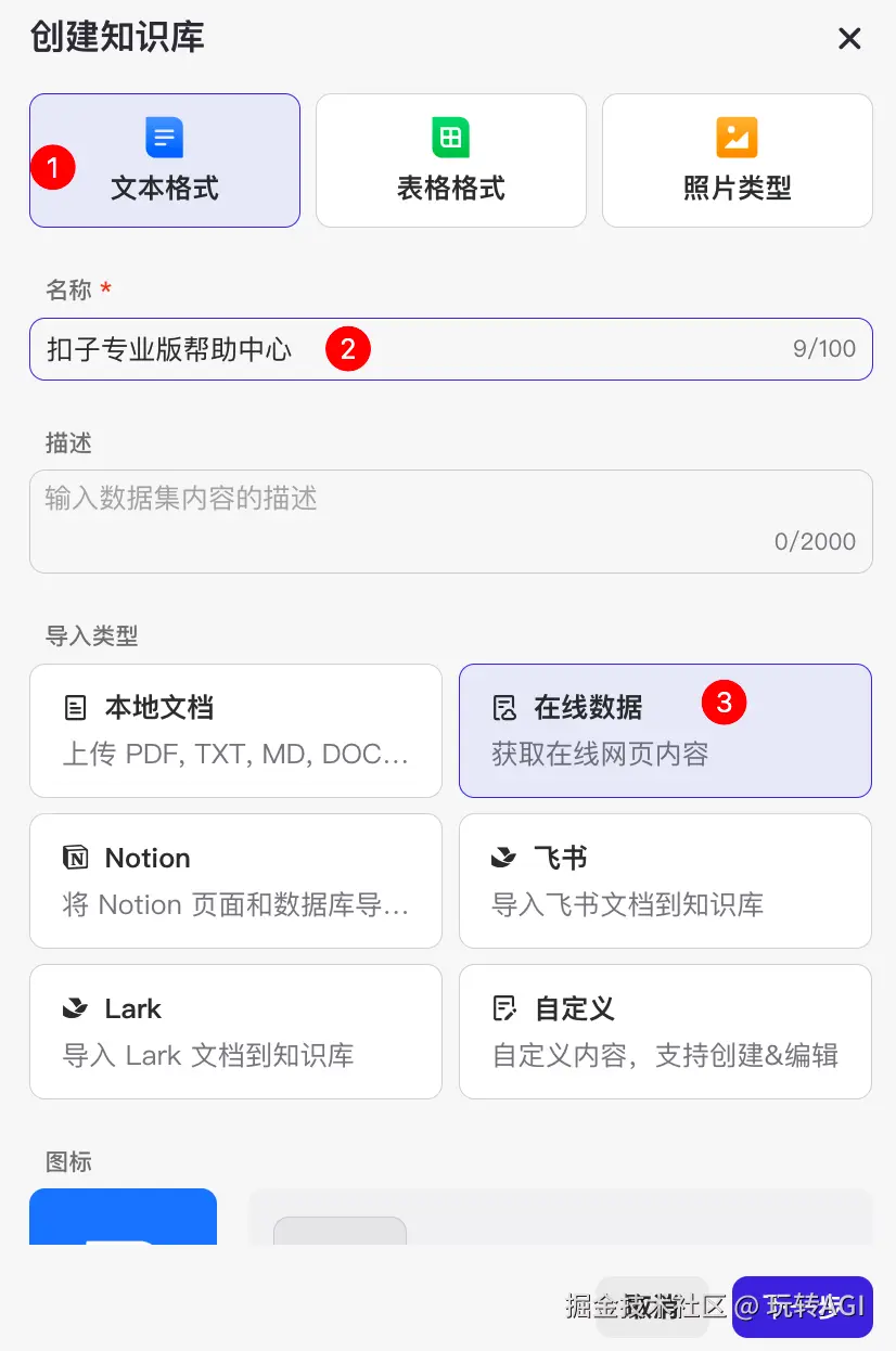 - 在创建知识库页面,选择文本格式,然后输入一个知识库名称,再选择在线数据,最后单击下一步。