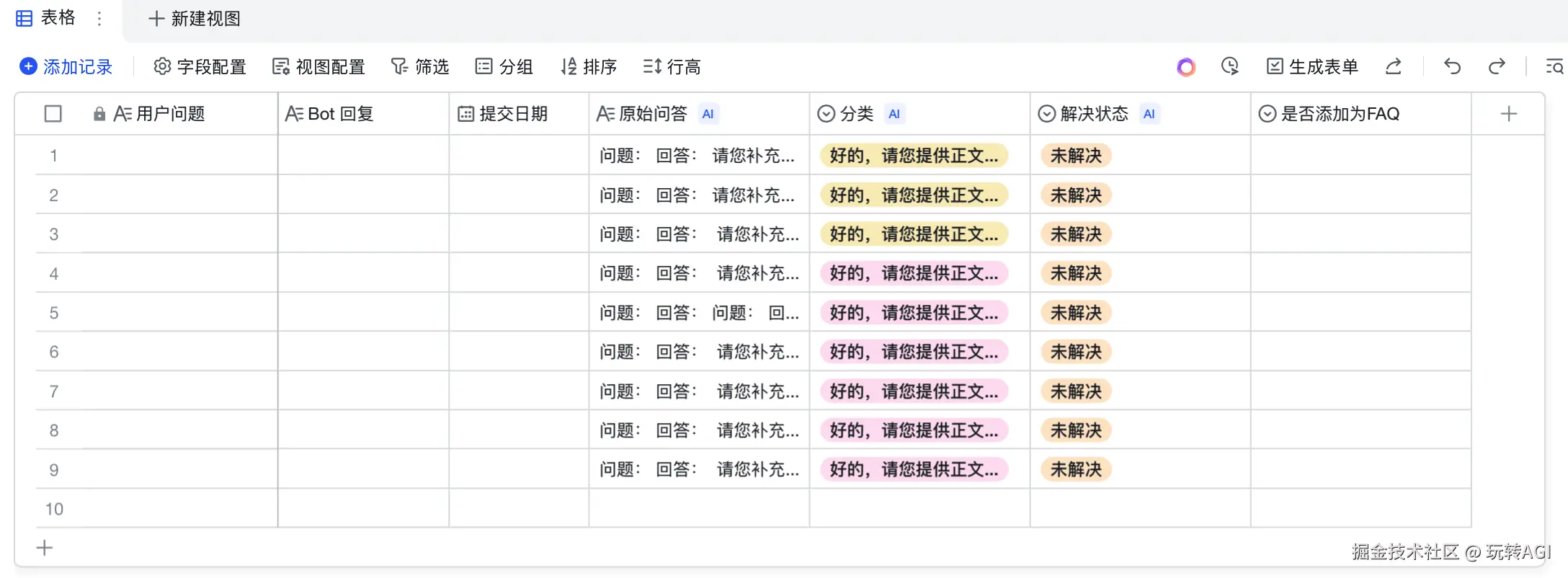 用户问题和 Bot 回复分别是用户提交的问题和智能体的回复内容。 原始问答、分类和解决状态都是通过多维表格的 AI 能力自动生成的。