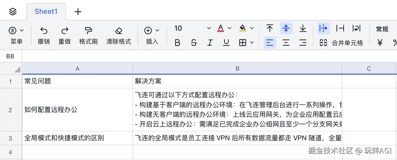- 创建一个飞书表格文档,并添加常见问题和解决方案两个字段。