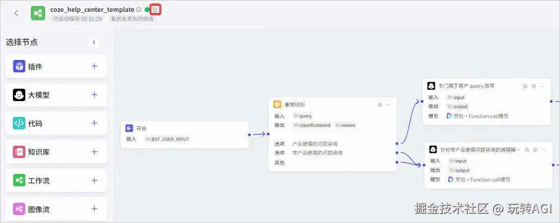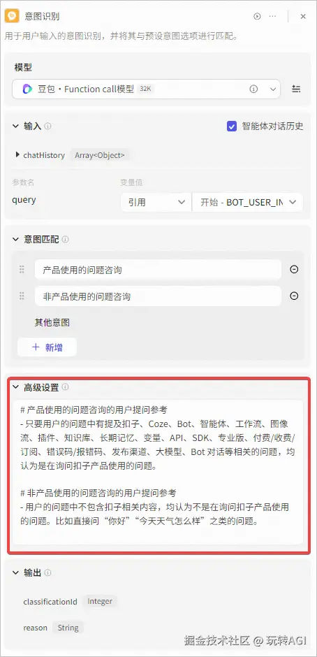 | 意图识别节点 | 判断用户是否在咨询与产品使用的相关问题。 实现方式:使用意图识别节点,基于豆包·Function call 模型对用户问题分类:扣子产品使用相关的问题、不相关的问题,并在高级设置中对问题分类的规则进行定义。 |