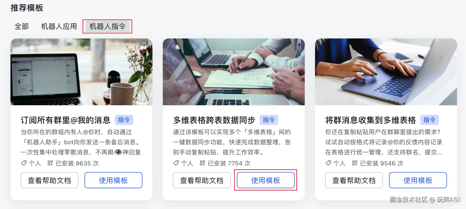 - 在机器人指令页签下,找到多维表格跨表数据同步,然后单击使用模板。